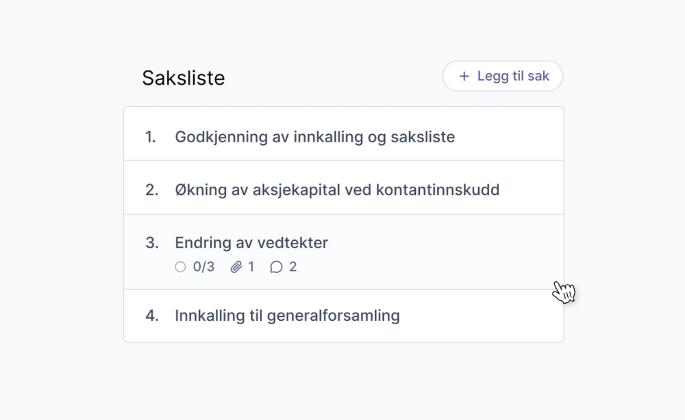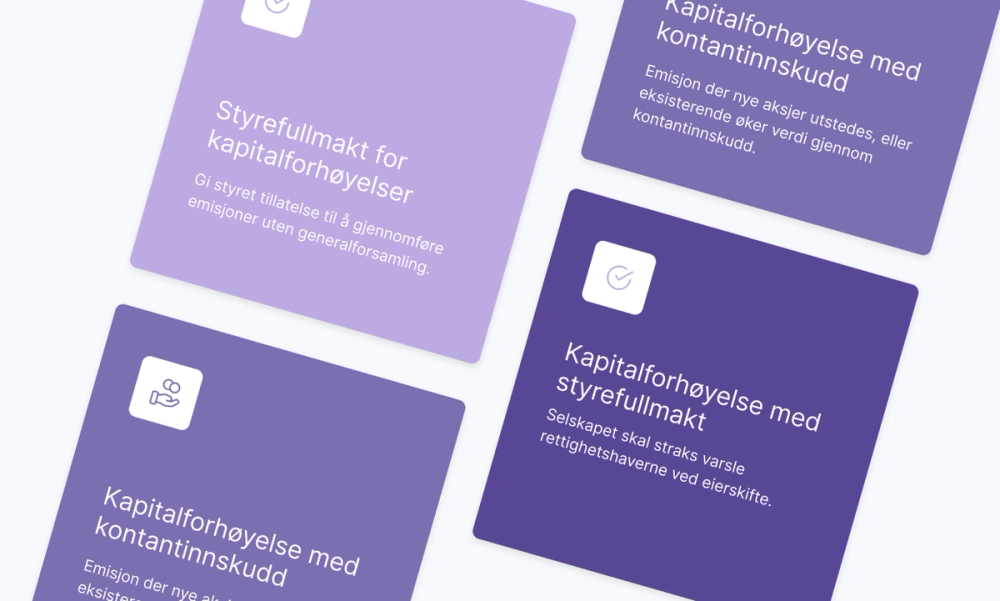 Med de innebygde veilederne i styreportalen Bård får du hjelp til gjennomføring av kapitalforhøyelsen. Etter at du har fylt ut den nødvendige informasjonen lager Bård automatisk forslag til saker for styremøte og generalforsamling til deg. På den måten er du sikret at den formelle delen av kapitalforhøyelsen er korrekt dokumentert i henhold til juridiske krav.