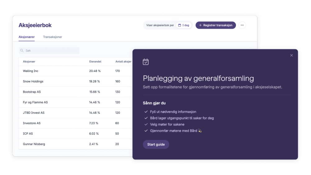 Det innebærer blant annet digital aksjeeierbok, generalforsamling og årsmøter, avstemninger, oppgaver, nøkkeltall og regnskapsintegrasjoner, digital signering med BankID, dokumentarkiv, maler og veiledere. Alt er samlet i samme portal, slik at styret slipper å hoppe mellom e-post, Word og andre systemer.