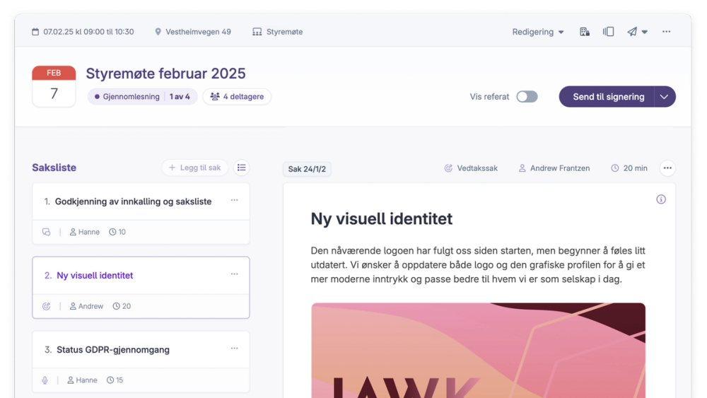 Nettopp derfor har vi brukt mye tid på å utvikle funksjonaliteten som tar styret gjennom et styremøte fra planlegging, til diskusjon, gjennomføring, protokollføring og helt til signering og arkivering.